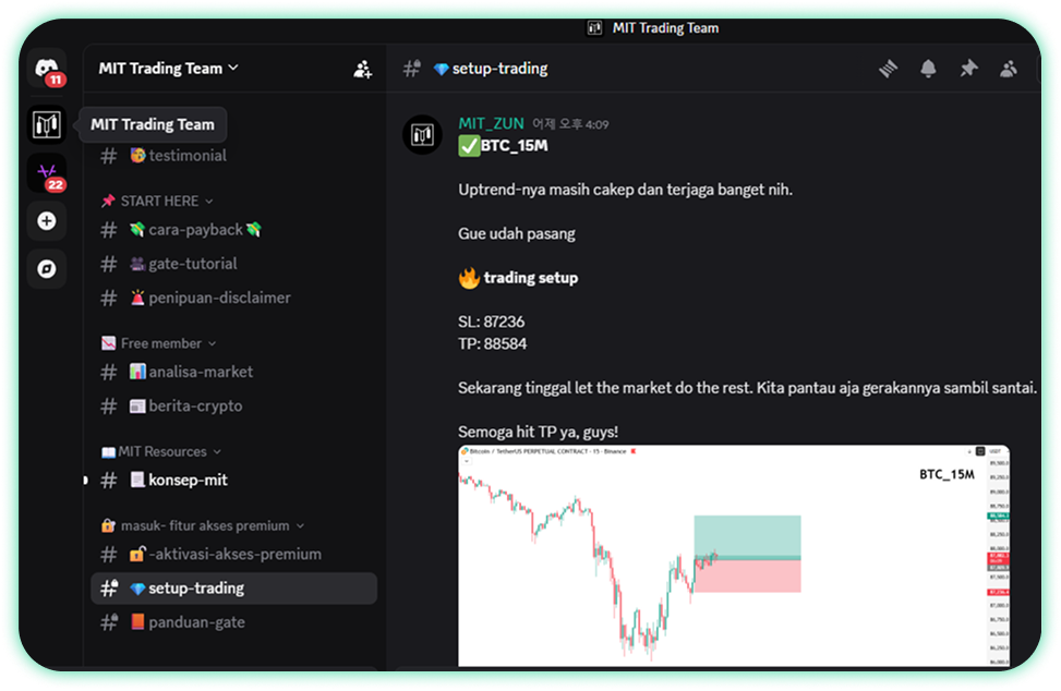 Daftar gratis sekarang dan dapatkan analisis trading profesional dari para trader MIT. Kami hanya menyediakan wawasan dengan probabilitas tinggi, tidak hanya untuk Bitcoin tetapi juga altcoin. Inilah strategi trading MIT, yang dibangun melalui ribuan pengujian dan jurnal trading yang teliti. Pelajari dan pelajari secara mendalam logika entri serta strategi keluar yang jelas